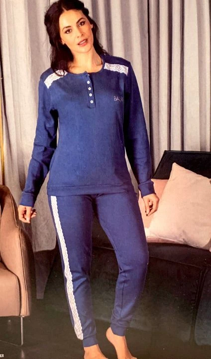 Pigiama Donna 100% cotone pesante Basile 673 outlet maglia aperta a serafino con inserti in pizzo e pantalone tinta unita con bordo alle caviglie