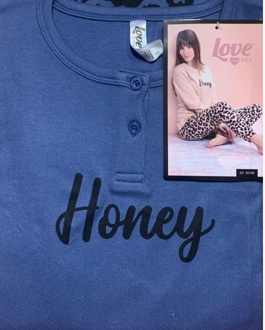 Pigiama Donna caldo cotone invernale Love and Bra 50199 Maglia girocollo con scritta sul davanti e pantalone fantasia animallier il tutto in cotone caldo invernale pesante. Disponibile nelle taglie S/42 M/44 L/46 XL/48 Phard/Nero e Bluette/Nero